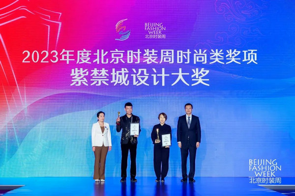北京市东城区人民政府副区长佟立志(左一),北京广播电视台党组成员、副总编辑边建(右一)为2023年度北京时装周“紫禁城设计大奖”获奖者颁奖