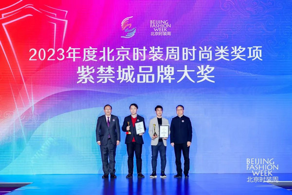 中国纺织工业联合会会长孙瑞哲(右一),北京时装周组委会主席团主席、北京时尚控股有限责任公司党委书记、董事长顾伟达(左一)为2023年度北京时装周“紫禁城品牌大奖”获奖品牌颁奖