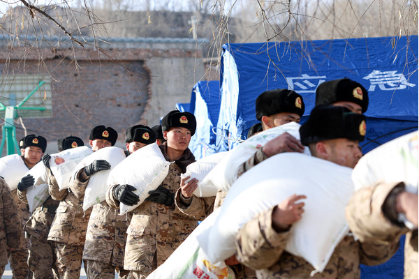 12月21日,武警甘肃总队临夏支队官兵在积石山县刘集乡阳屲村为受灾群众搬运面粉。新华社发(侯崇慧摄)