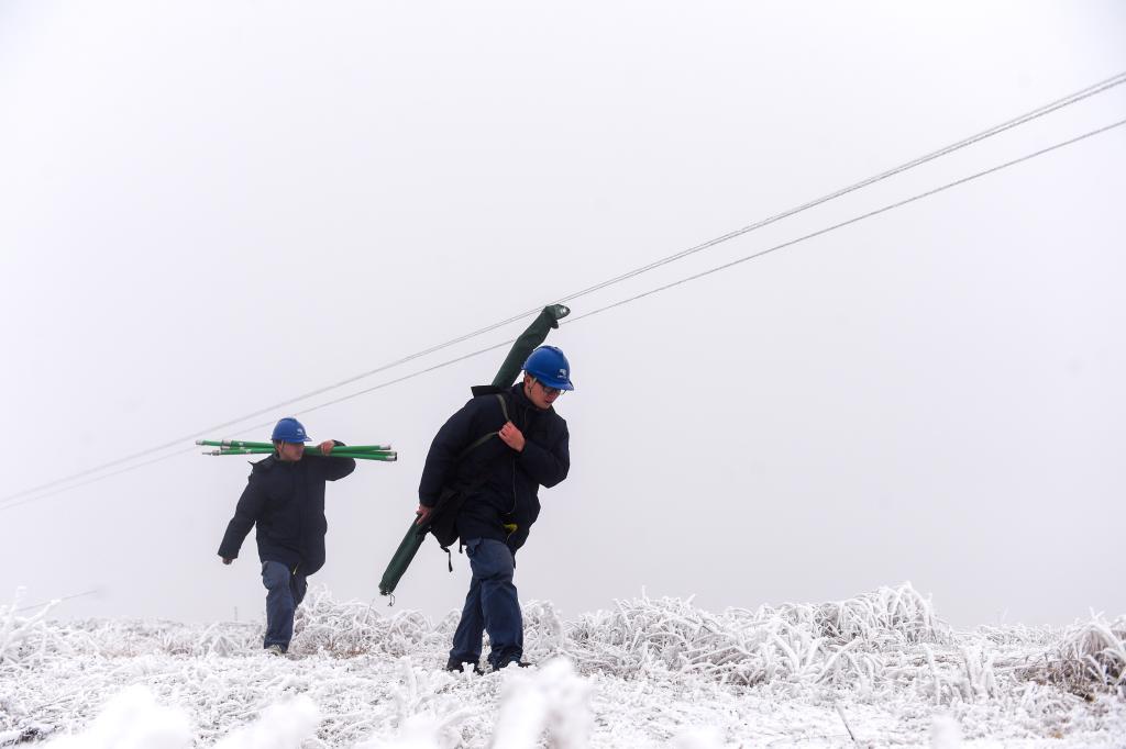 12月17日,南方电网贵州电网公司员工前往台江县红阳万亩草场,对位于最高点的10千伏电力线路进行观冰巡视,加强设备运行维护,确保电网安全运行。(南方电网贵州电网公司供图)