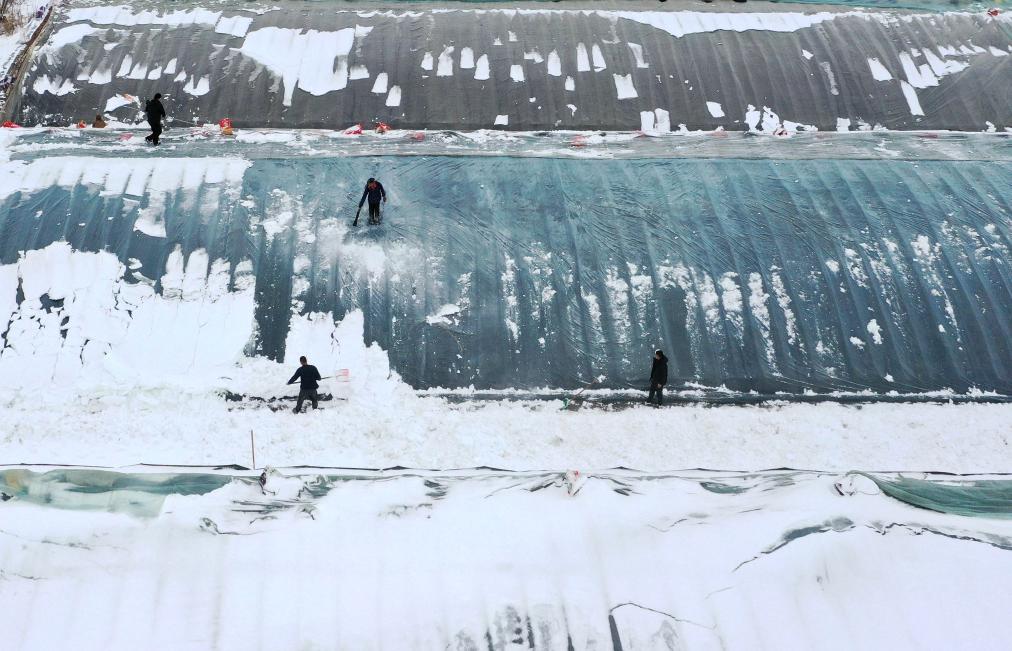 12月15日,山东省滨州市滨城区杨柳雪镇的农民在清理蔬菜大棚上的积雪(无人机照片)。新华社发(初宝瑞摄)