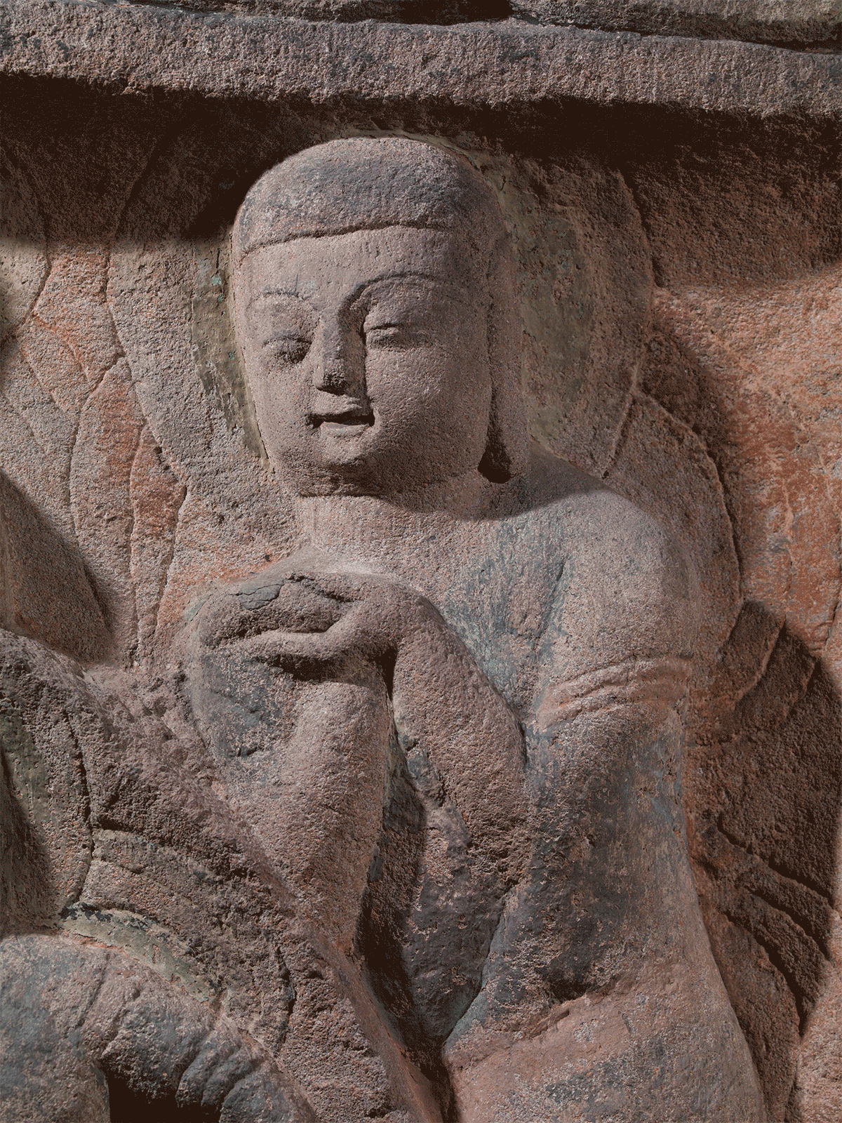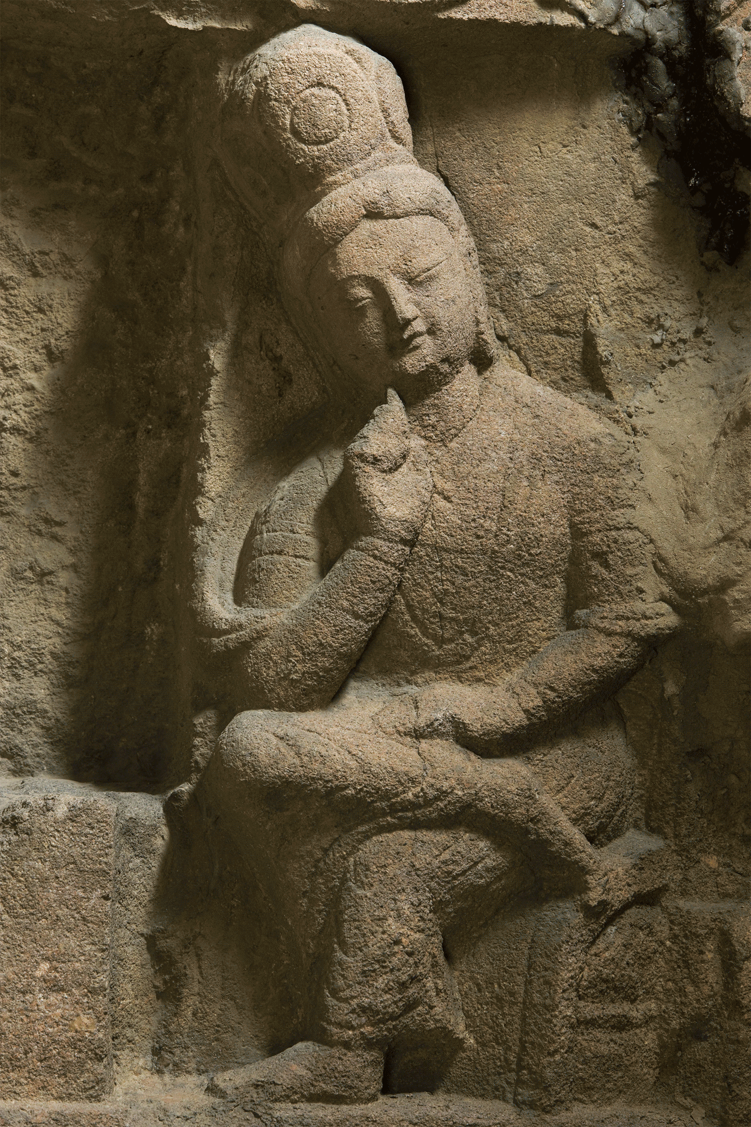 食指轻触面颊,颔首沉思,呈“舒相坐”