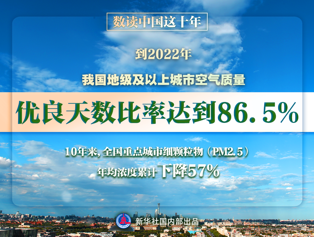 天更蓝、空气更清新。10年来,我国淘汰“散乱污”企业,实施北方地区清洁取暖,推动货物运输“公转铁”,提高机动车油品排放标准……打好产业、能源、交通结构转型的“组合拳”。到2022年,全国PM2.5年均浓度达到29微克/立方米,地级及以上城市空气质量优良天数比率达到86.5%。