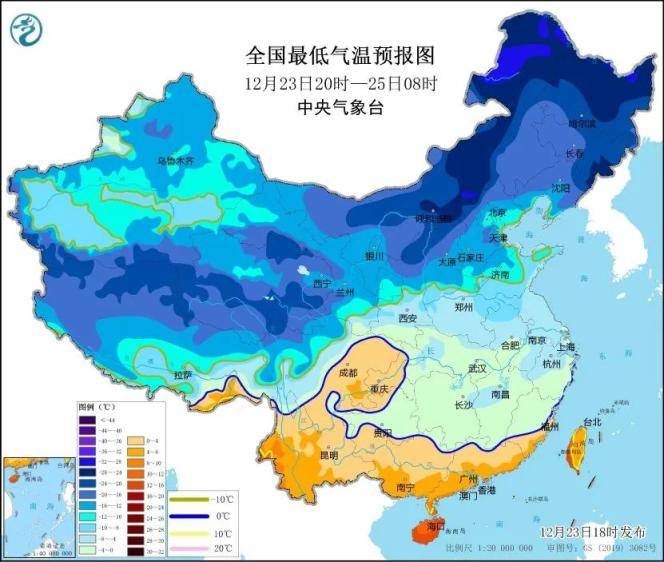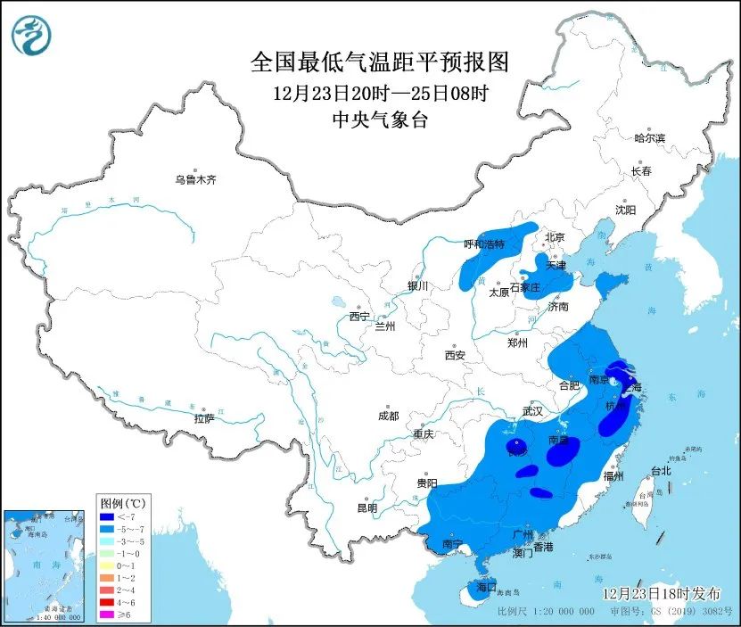 预计23日20时至25日08时,江淮、江南、华南以及山东西北部和半岛地区、河北南部和西北部、山西北部、陕西北部等地日最低气温较历史同期偏低5~7℃,其中浙江中部、江西中部等地偏低7℃以上,最低气温0℃线将位于贵州南部至华南北部一带。