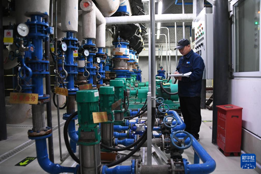 12月23日,在北京交通大学供暖交换站,工作人员查看供暖设备运行情况。