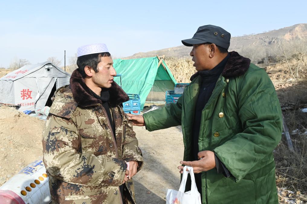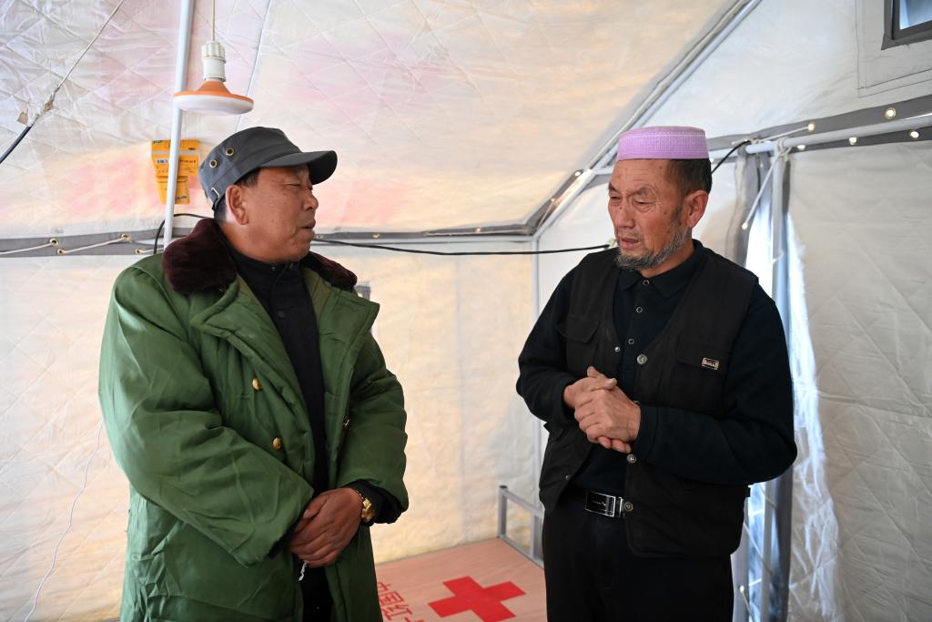 12月22日,在积石山县大河家镇克新民村,党支部书记张辉林(左)询问村民马辉文家安置情况。新华社记者 范培珅 摄