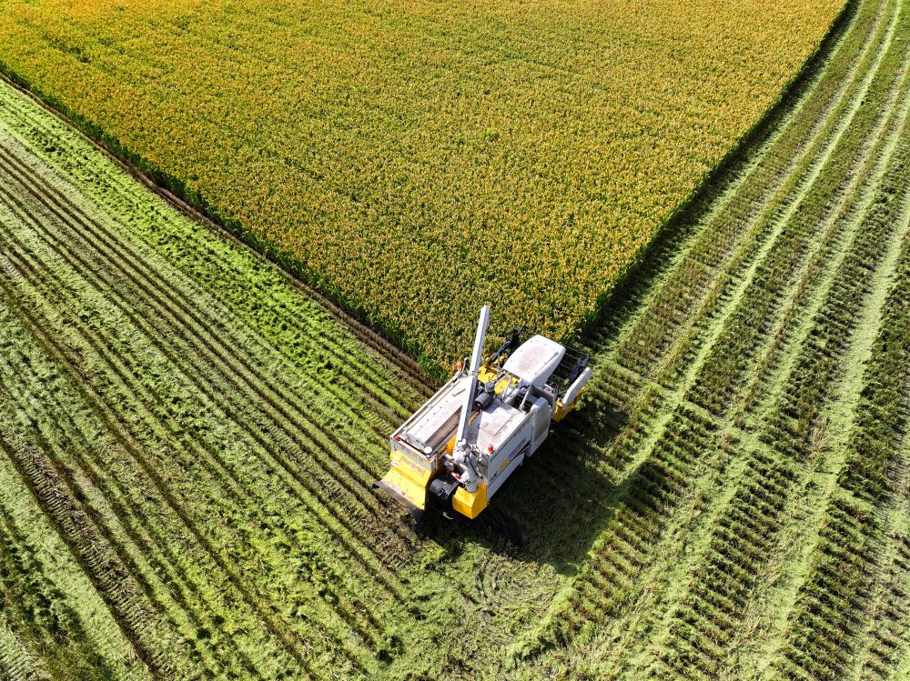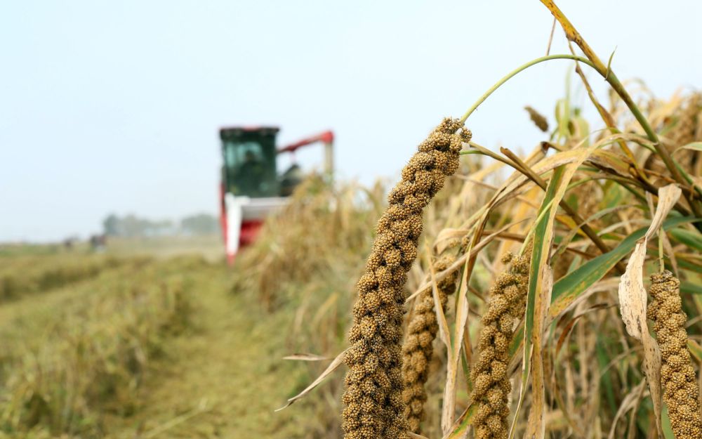 10月10日,在河南省洛阳市汝阳县蔡店乡蟒庄村高标准农田谷子地,农民驾驶收割机在收获谷子。新华社发(康红军摄)