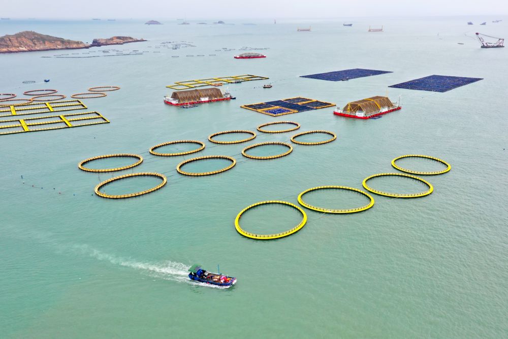 10月10日,福建省连江县定海湾内渔船经过深水网箱、渔排及深远海养殖平台(无人机照片)。新华社记者姜克红摄