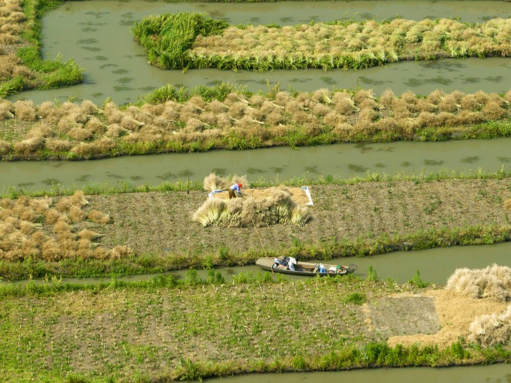 5月28日,农民在兴化市千垛景区采收油菜籽(无人机照片)。新华社发(周社根摄)