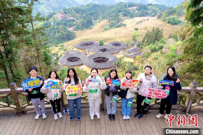 参加南靖土楼马拉松赛的台湾青年在土楼景区打卡拍照。共青团漳州市委供图