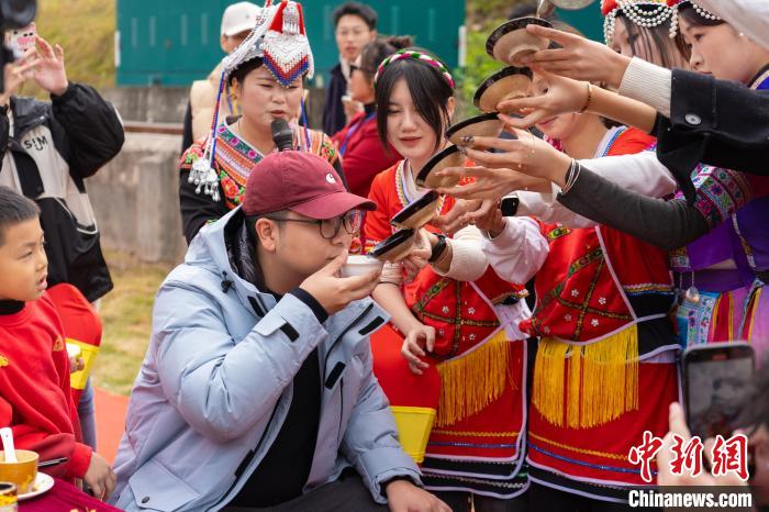 23日中午,台青代表和当地村民共进“长桌宴”午餐。记者注意到,餐桌上放置着寓意团圆的摆台,大家在其乐融融的氛围中品尝寓意“两岸一家亲”的传统闽台特色菜品,两岸青年们时不时与巡游队伍互动,与高山族、畲族演员席间拉歌,用一句句祝酒词传递美好祝福,现场气氛欢乐活跃。