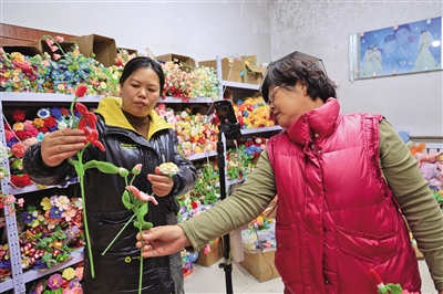 常珊是一名网店老板,她卖的是目前网上“火”出圈的“毛线花束”——一种用五颜六色的毛线针织的花束。常珊的直播间里有“玫瑰”“向日葵”“郁金香”“牡丹”等,顾客说明想要的花束后,她将花束搭配一起,在镜头前展示给顾客看。顾客确认后,她再将花束打包、发货。