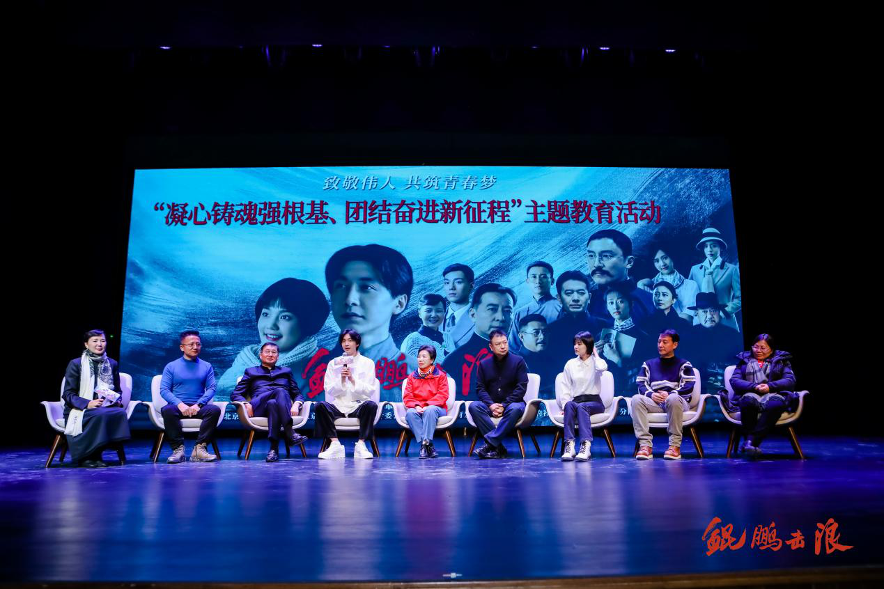 《鲲鹏击浪》和北京有缘,剧中的北大红楼、北大图书馆、北京三眼井胡同、福佑寺都留下了青年毛泽东探索中国革命道路的奋斗足迹,毛泽东在北京的三年学习与生活,让他从一名有志向的青年,成长为坚定的马克思主义者,并带领中国人民走向了美好生活。活动现场,北京市文学艺术界联合会副主席张良学致辞表示:“回顾毛泽东同志对中华民族的伟大贡献,传承红色基因,感受毛泽东同志的崇高品质和革命精神,不断巩固共同思想基础,将激发广大党外知识分子、新的社会阶层人士为中华民族伟大复兴而努力奋斗。让我们共同致敬伟人、致敬青春,鲲鹏展翅九万里,同筑伟大中国梦。”