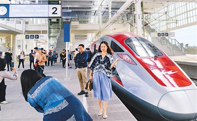 中印尼共建“一带一路”合作的标志性项目——雅万高铁于10月17日正式开通运营。图为当日印度尼西亚万隆德卡鲁尔站,乘客在站台上和雅万高铁高速动车组列车合影。新华社记者 徐 钦摄