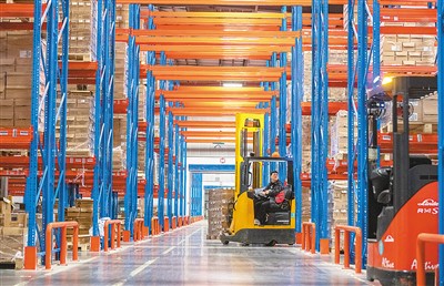 2023年“双11”期间,浙江省金华市金义保税区跨境电商迎来发货高峰,工人忙着运送货物。时宽兵摄(人民视觉)