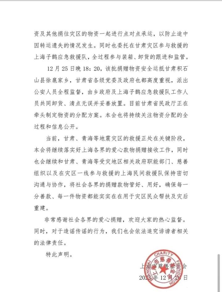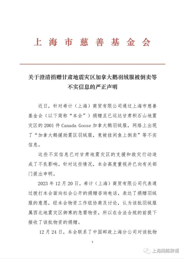 12月26日晚,上海市慈善基金会发表严正声明:捐赠甘肃地震灾区加拿大鹅羽绒服被倒卖等系不实信息。