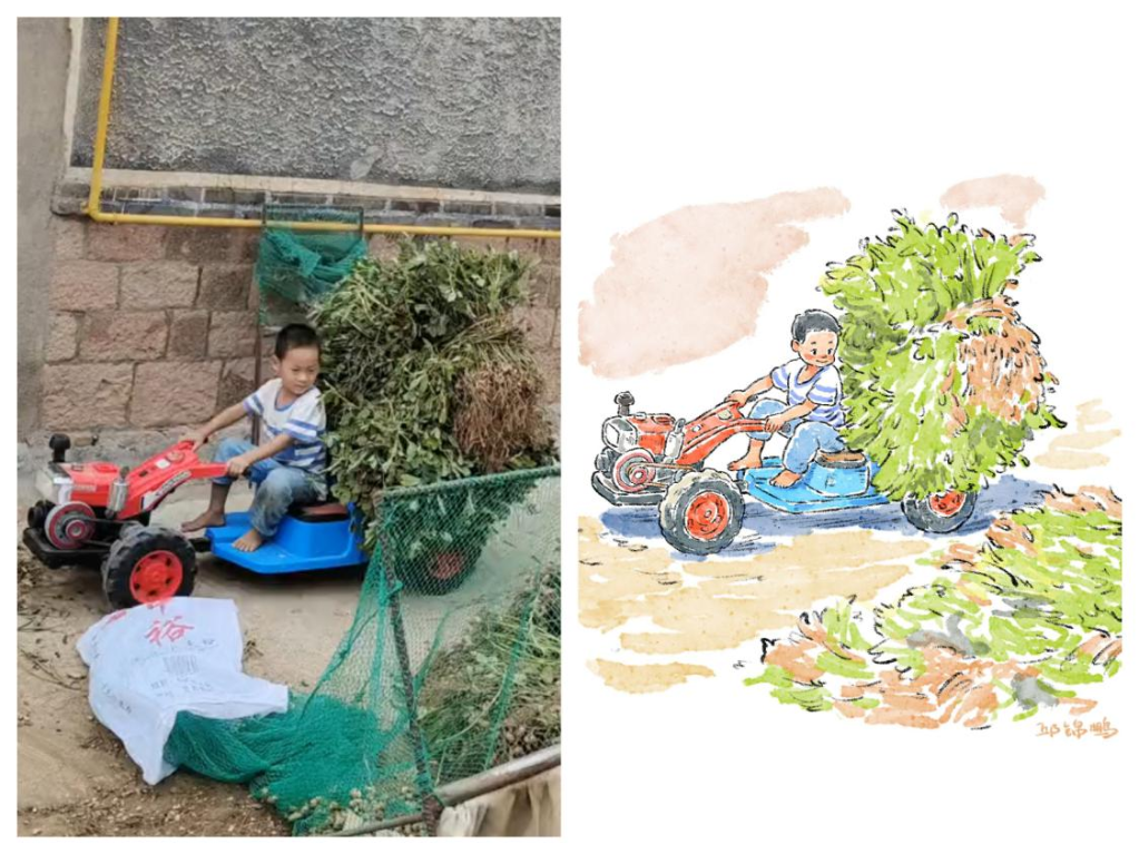 是开着玩具拖拉机帮家人收花生