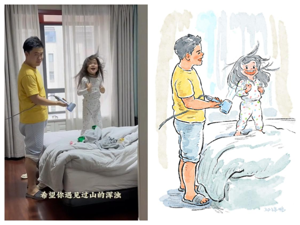 是女儿被爸爸吹起的头发