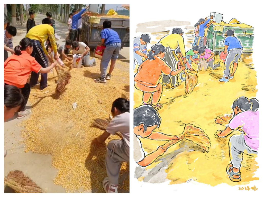 是帮农民伯伯盛起散落一地的粮食