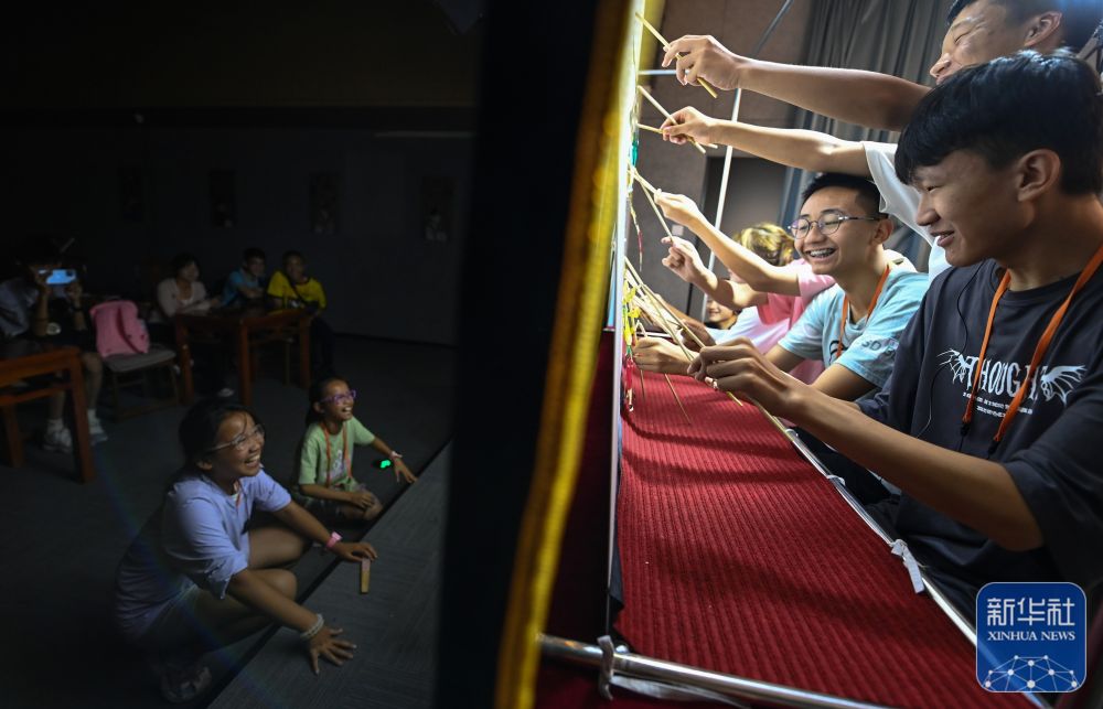 8月8日,进行暑期研学的学生在中国秦腔艺术博物馆里体验皮影戏演出。