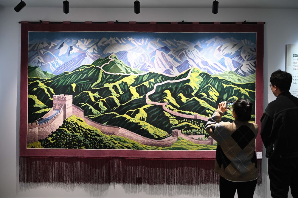 ↑长城壁毯长10米,高5米,画面阳光灿烂,树木郁郁葱葱,庄严雄伟,气势磅礴。(新华社发)