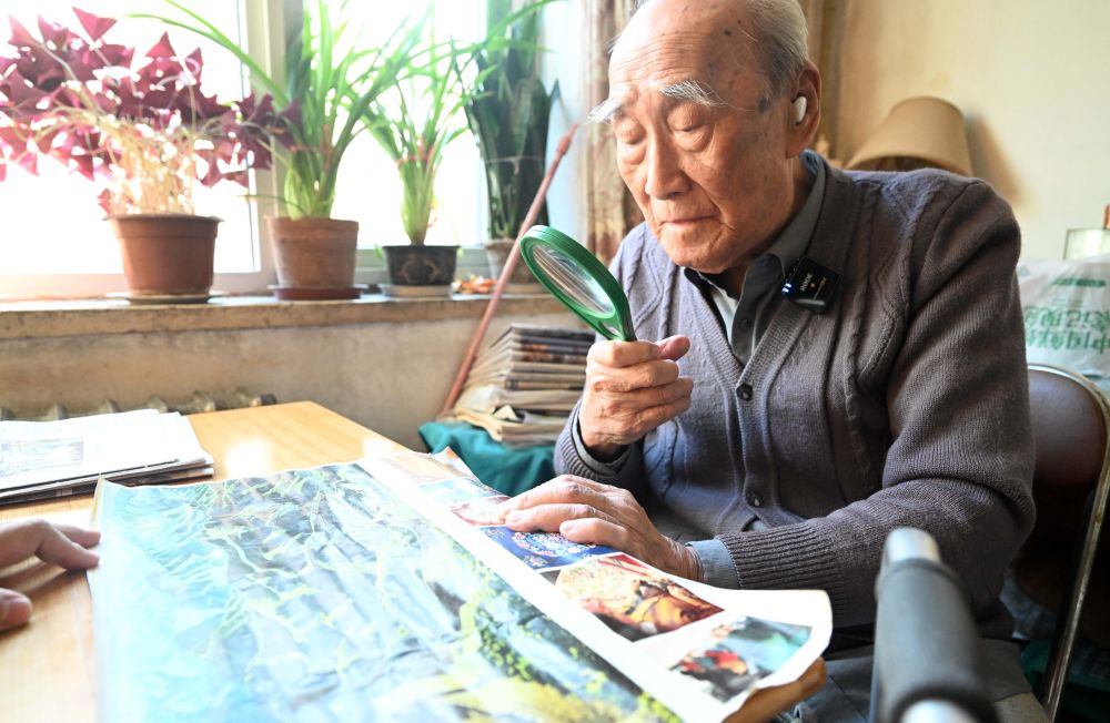 ↑郭庆林在家中用放大镜查看长城壁毯的照片。(新华社记者 赵子硕 摄)