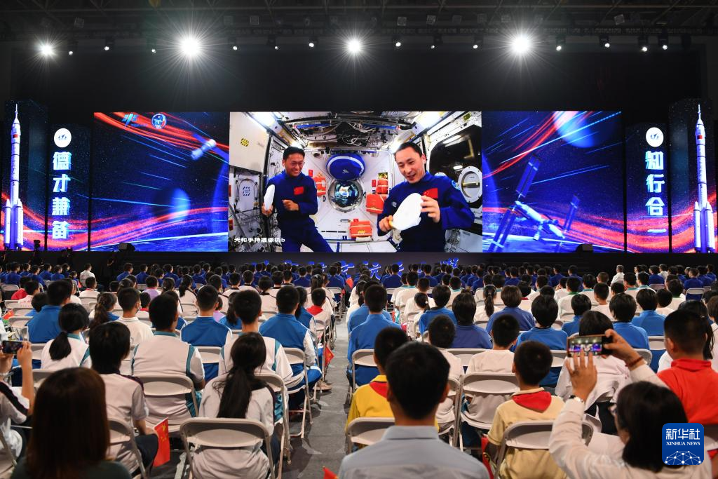 9月21日,在北京航空航天大学,学生收看“天宫课堂”第四课。神舟十六号航天员景海鹏、朱杨柱、桂海潮在轨展示介绍中国空间站梦天实验舱工作生活场景,演示球形火焰实验、奇妙“乒乓球”实验、动量守恒实验以及又见陀螺实验,并与地面课堂进行互动交流。新华社记者 鞠焕宗 摄