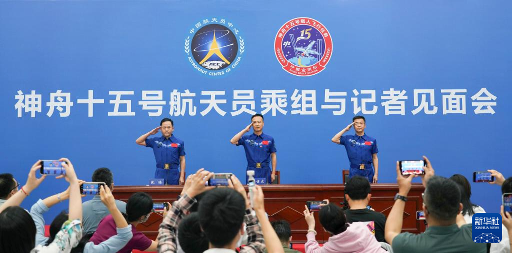 7月31日下午,中国航天员科研训练中心在北京航天城举行神舟十五号航天员乘组与记者见面会。费俊龙(中)、邓清明(右)、张陆3名航天员从太空返回57天后首次正式公开亮相。新华社记者 郭中正 摄