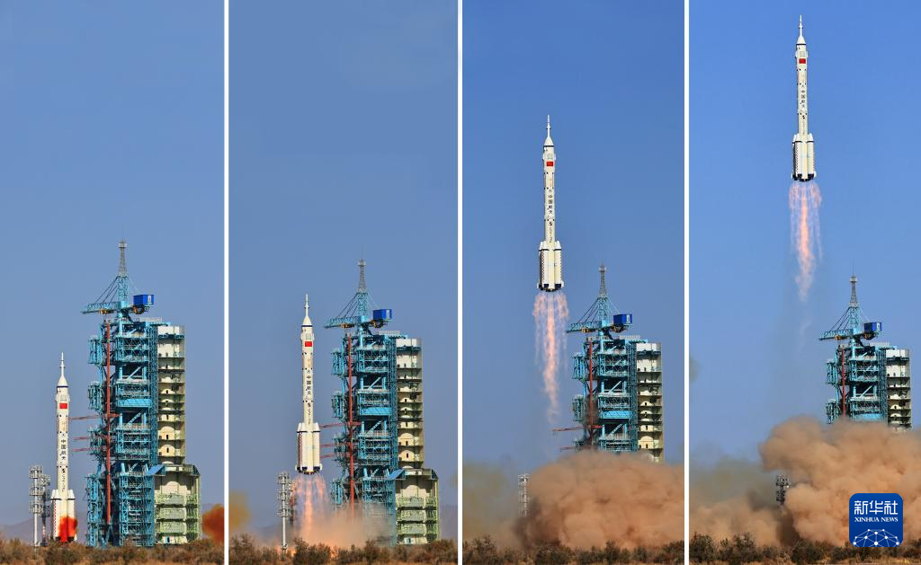 10月26日11时14分,搭载神舟十七号载人飞船的长征二号F遥十七运载火箭在酒泉卫星发射中心点火发射(拼版照片)。新华社记者 李刚 摄