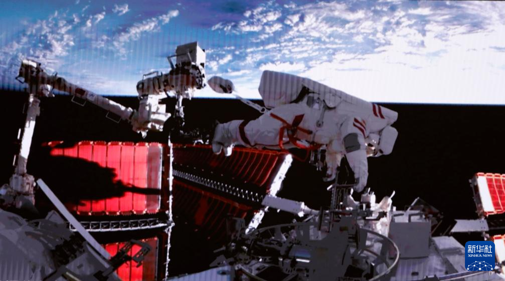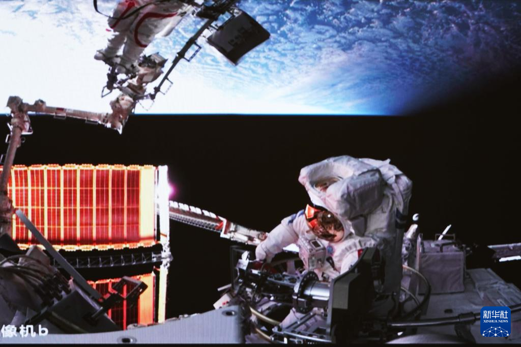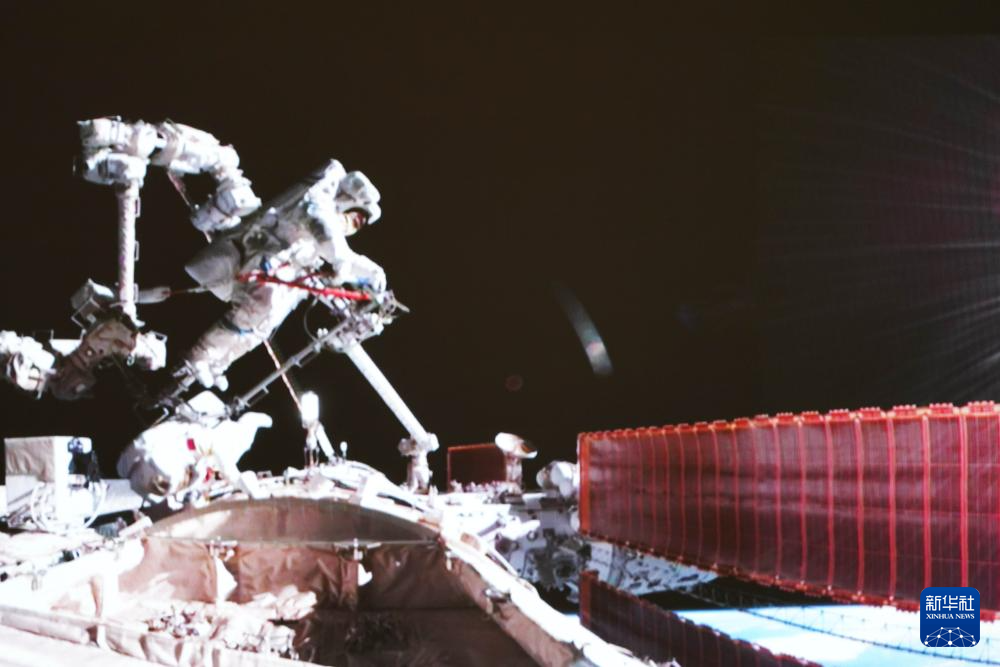 7月20日在北京航天飞行控制中心拍摄的神舟十六号航天员景海鹏(上)、朱杨柱开展舱外操作的画面。7月20日21时40分,经过约8小时的出舱活动,神舟十六号航天员景海鹏、朱杨柱、桂海潮圆满完成出舱活动全部既定任务。新华社记者 郭中正 摄