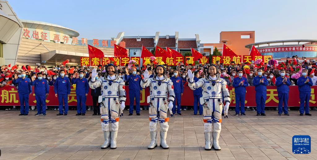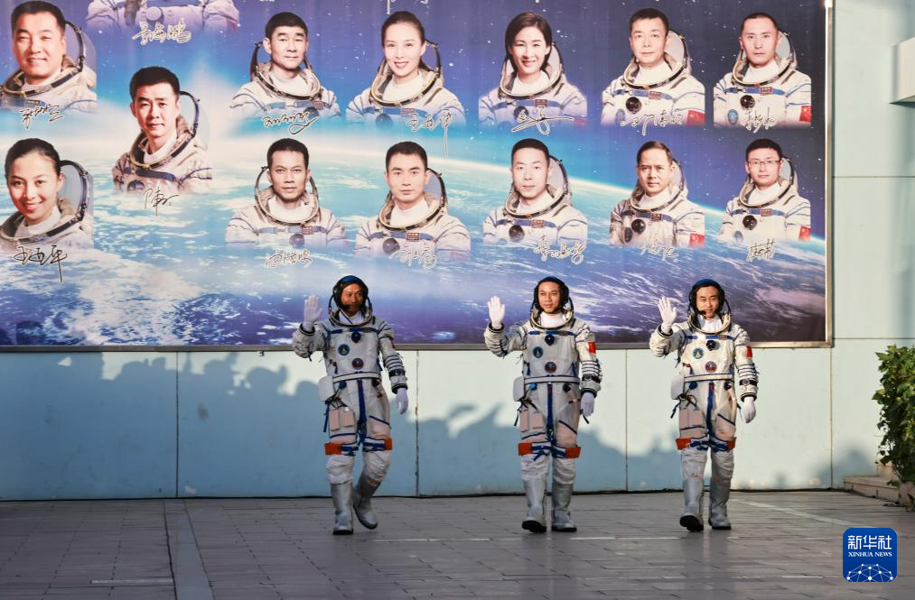 5月30日6时42分,神舟十六号载人飞行任务航天员乘组出征仪式在酒泉卫星发射中心问天阁圆梦园广场举行。这是航天员景海鹏(右)、朱杨柱(中)、桂海潮在出征仪式上。新华社记者 李刚 摄