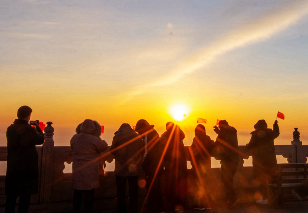 游客在山东省临沂市沂蒙山银座天蒙旅游区观看日出(2023年1月1日摄)。新华社发(武纪全 摄)