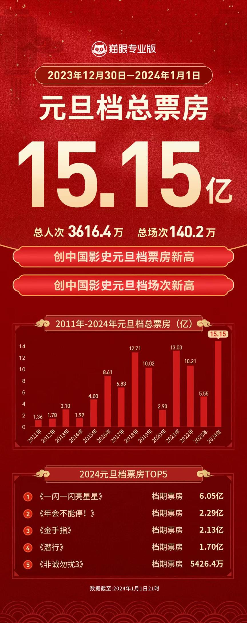 据猫眼专业版数据,截至1月1日21时,2024元旦档(12月30至1月1日)总票房15.15亿元,创下中国影史元旦档票房新高,总观影人次3616.4万,总场次140.2万,创中国影史元旦档总场次新高。
