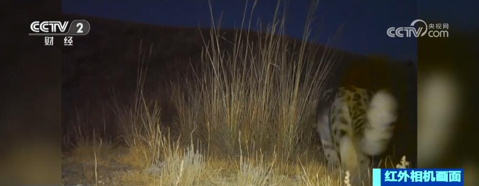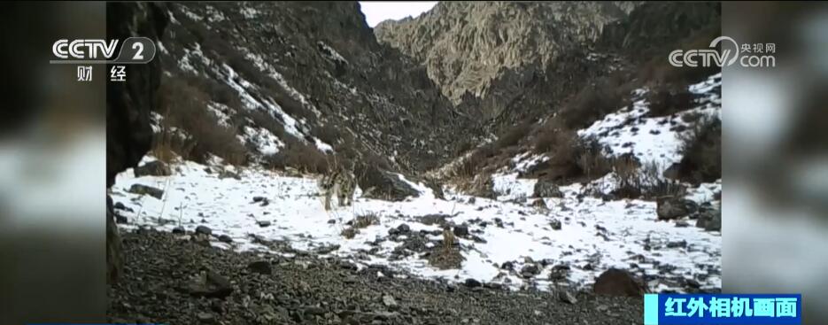 近日,在新疆乌苏南部山区,红外相机拍摄到雪豹出没的影像,而且是三只雪豹同框的身影。画面中,三只成年雪豹体型健硕,慢悠悠地先后依次经过红外相机,它们在雪地上边走边觅食,并不时在草丛中停留。