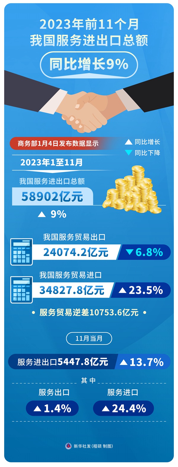 商务部4日发布数据显示,2023年1至11月,我国服务进出口总额58902亿元,同比增长9%。