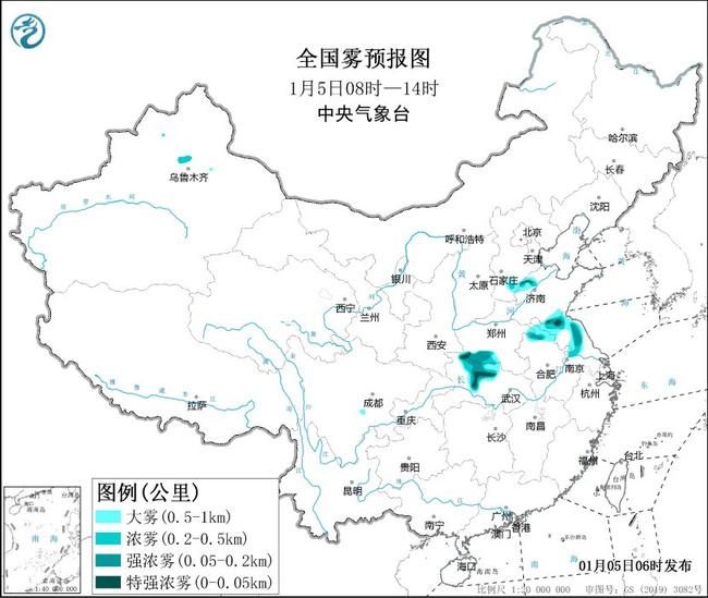 预计,5日早晨至上午,河北南部、山东西北部、江苏中北部、安徽北部、河南南部、湖北北部等地的部分地区有大雾,其中江苏中北部、河南南部、湖北北部等地的部分地区有能见度低于200米的强浓雾,局地有能见度低于低于50米的特强浓雾。
