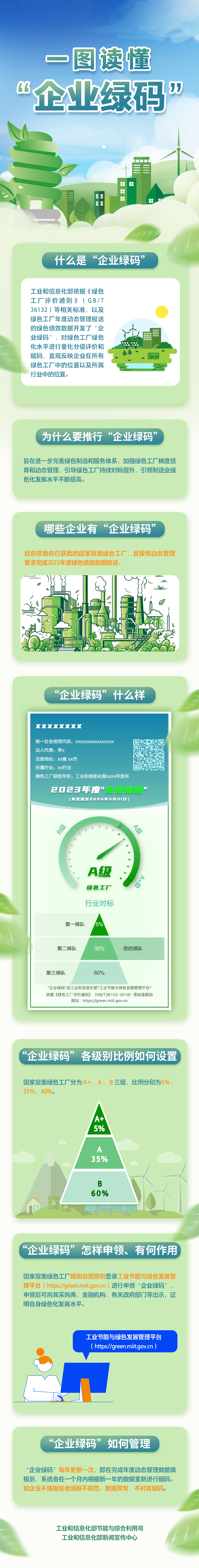 二、工业和信息化部依据《绿色工厂评价通则》(GB/T 36132)等相关标准,以及2023年度绿色工厂动态管理报送的绿色绩效数据开发了“企业绿码”,对绿色工厂绿色化水平进行量化分级评价和赋码,直观反映企业在所有绿色工厂中的位置以及所属行业中的位置。国家层面绿色工厂分为A+、A、B三级,比例分别为5%、35%、60%。国家层面绿色工厂按照自愿原则登录工业节能与绿色发展管理平台(https://green.miit.gov.cn,以下称管理平台)进行申领“企业绿码”,申领后可向其采购商、金融机构、有关政府部门等出示,证明自身绿色化发展水平。“企业绿码”每年更新一次,即在完成年度动态管理数据填报后,系统会在一个月内根据新一年的数据重新进行赋码。如企业不填报或者填报不规范、数据异常,不对其赋码。