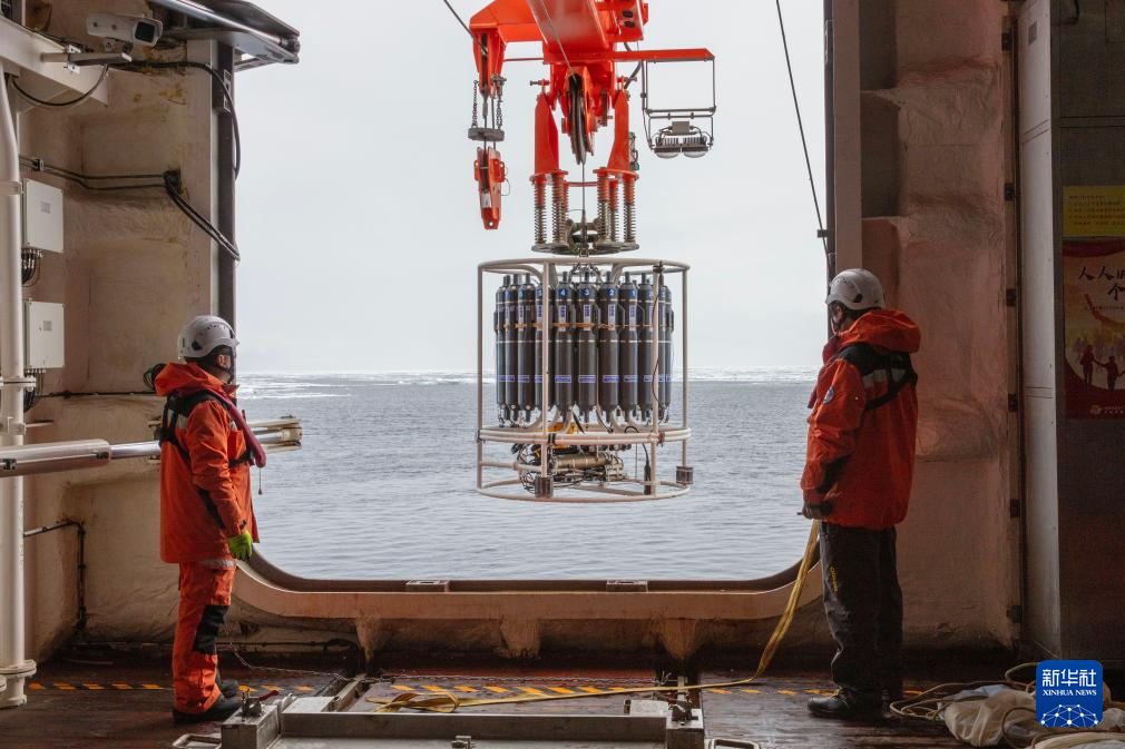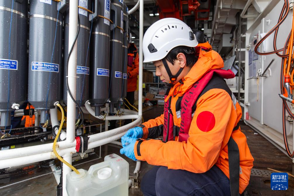 北京时间1月7日,考察队员在收集CTD(温盐深剖面仪)采集的海水样品。