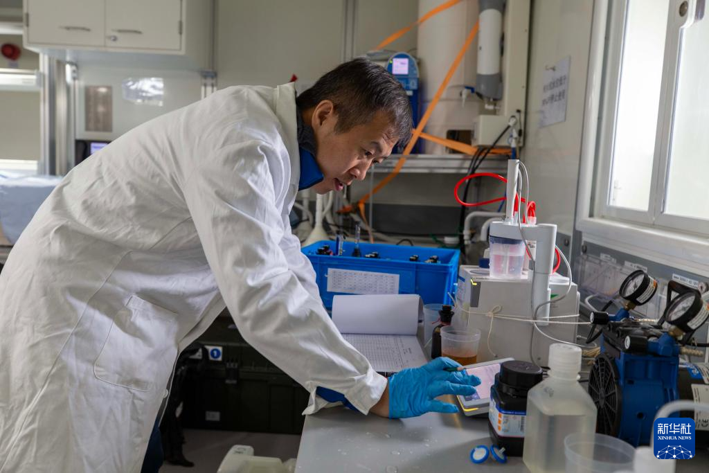 北京时间1月7日,考察队员侯继灵在实验室内分析海水样品。