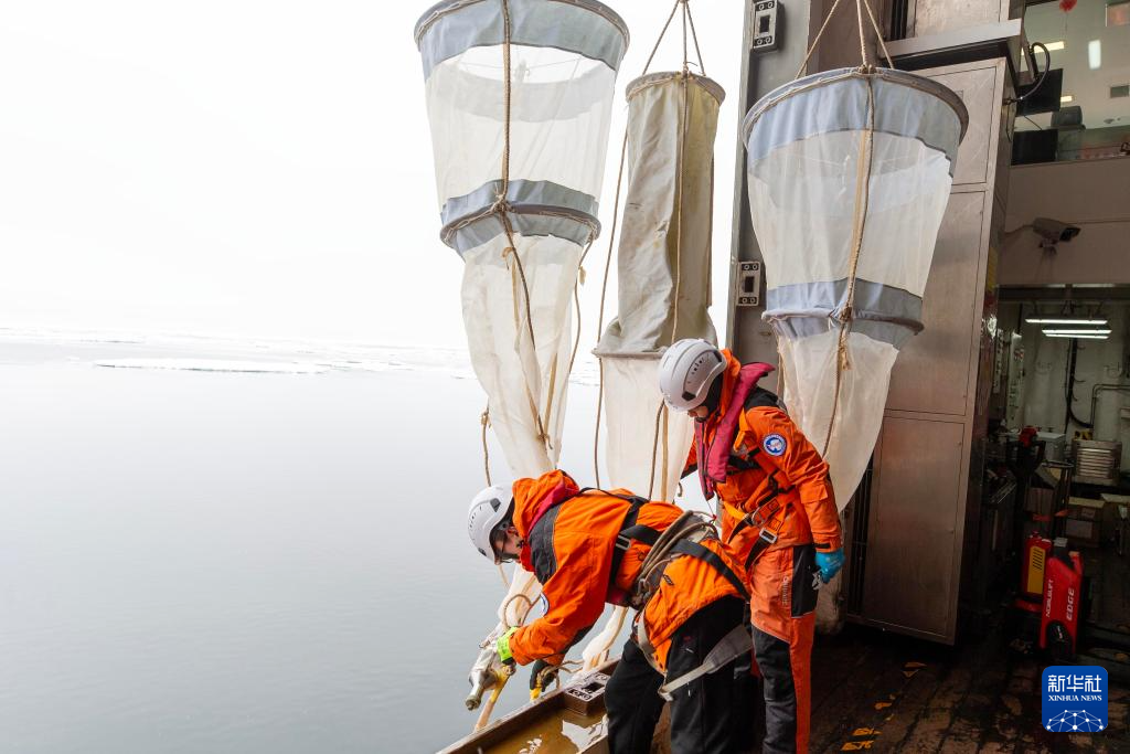 北京时间1月7日,“雪龙2”号月池车间,考察队员在下放垂直网。