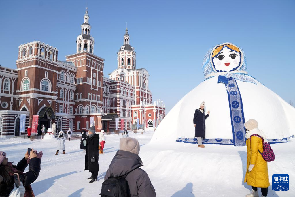 1月7日,游客在伏尔加庄园的一处大雪人前游玩、拍照。