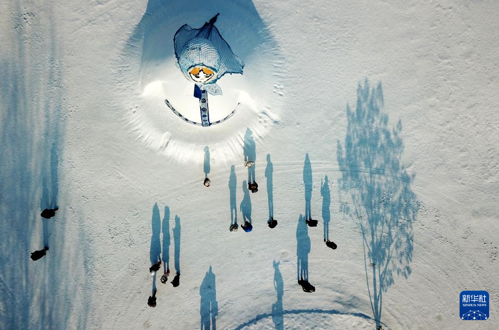 1月7日,游客在伏尔加庄园的一处大雪人前游玩、拍照(无人机照片)。