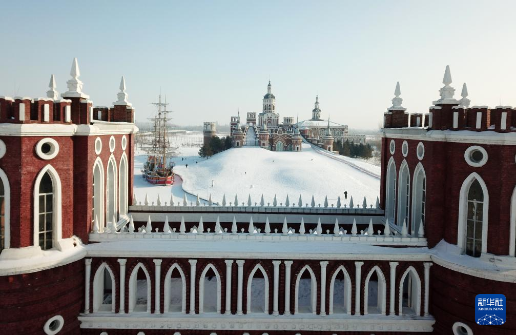 1月7日,游客在伏尔加庄园游玩(无人机照片)。