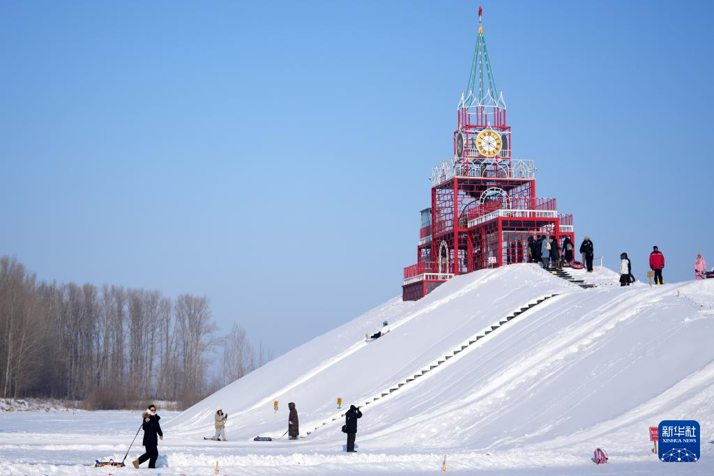 1月7日,游客在伏尔加庄园体验冰雪娱乐项目。