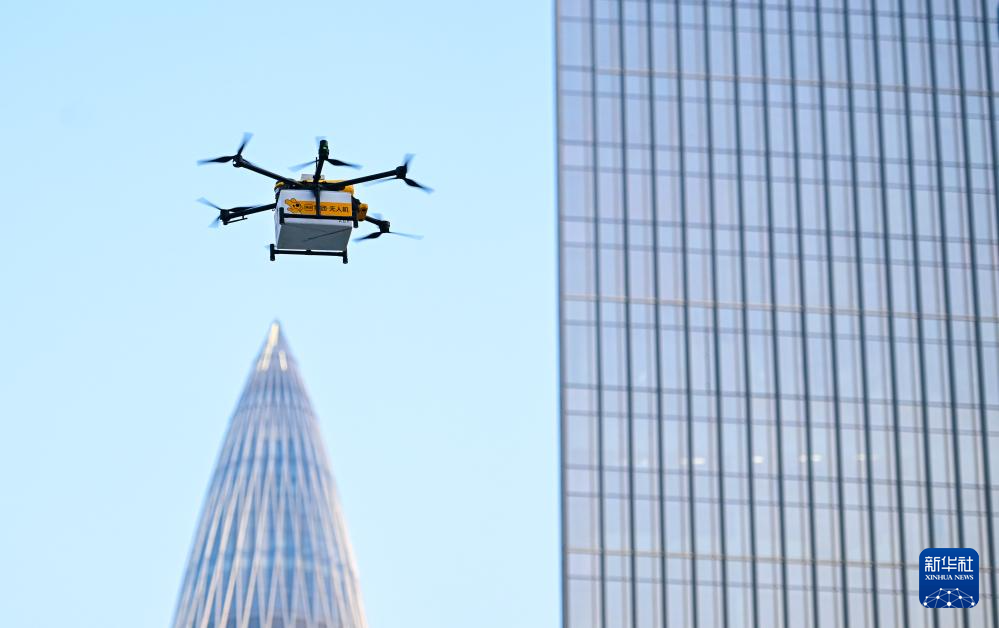 美团送餐无人机穿行在深圳市后海片区的楼宇之间(2023年11月24日摄)。新华社记者 毛思倩 摄