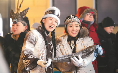 1月6日,戴着鱼皮头饰的赫哲族姑娘(右)与黑龙江省饶河县文旅推荐官在哈尔滨中央大街上推介家乡特产鱼品。新华社记者 王建威摄