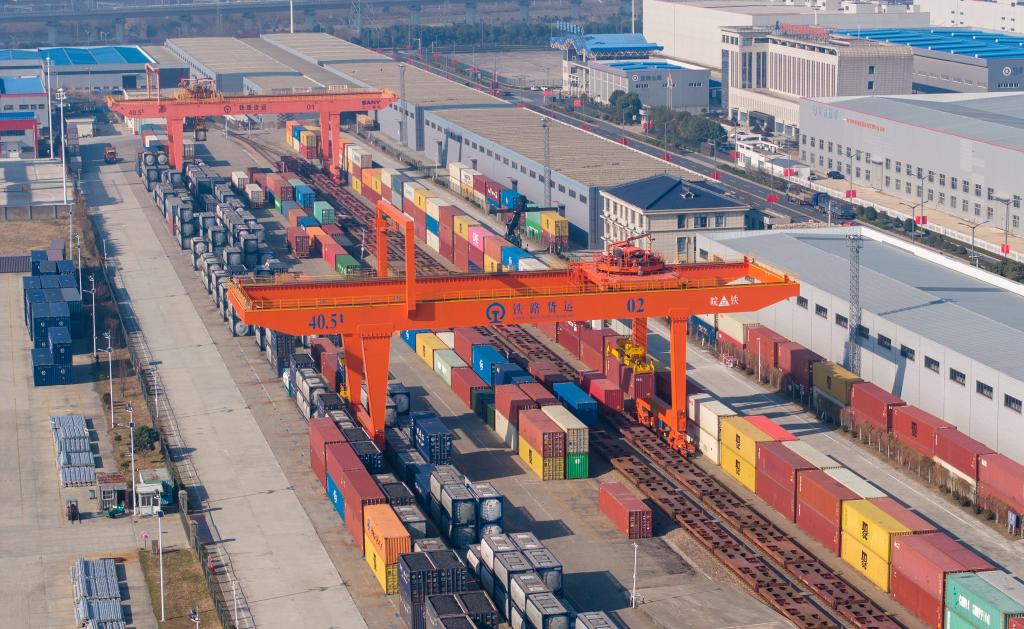 2023年12月25日,在中国铁路上海局集团有限公司海安物流基地,集装箱门吊进行集装箱装运作业。新华社发(翟慧勇摄)