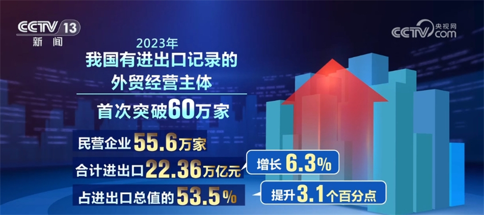 2023年,我国有进出口记录的外贸经营主体首次突破60万家。其中,民营企业55.6万家,合计进出口22.36万亿元,增长6.3%,占进出口总值的53.5%,提升3.1个百分点。