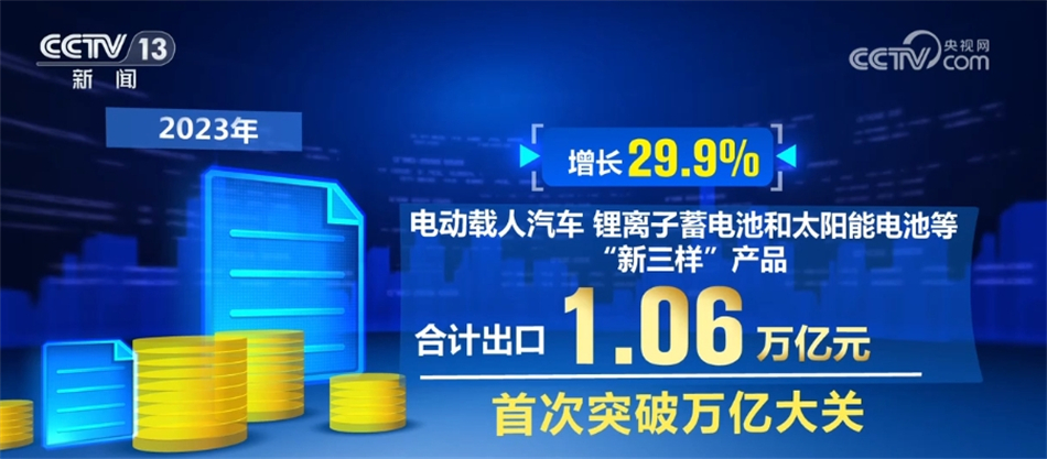 出口方面,产品竞争优势稳固,出口动能丰富活跃。2023年,我国出口机电产品13.92万亿元,增长2.9%,占出口总值的58.6%。其中,电动载人汽车、锂离子蓄电池和太阳能电池等“新三样”产品合计出口1.06万亿元,首次突破万亿大关,增长29.9%。