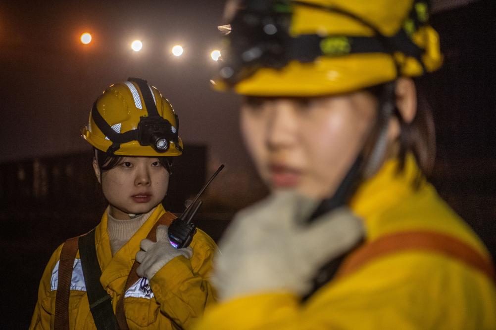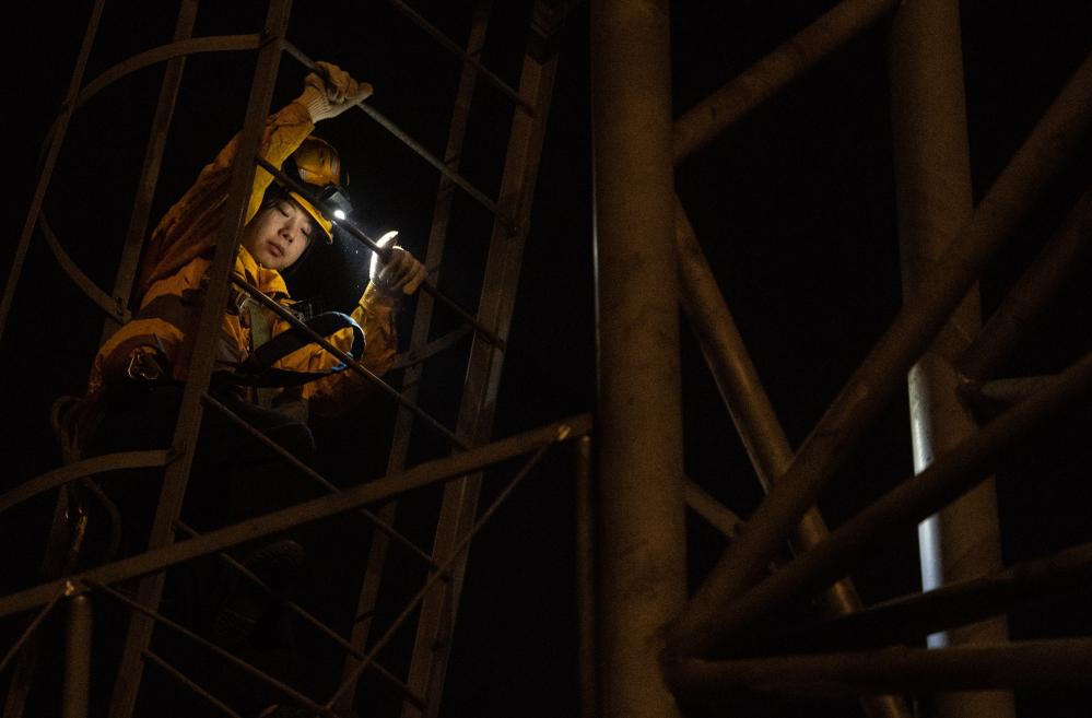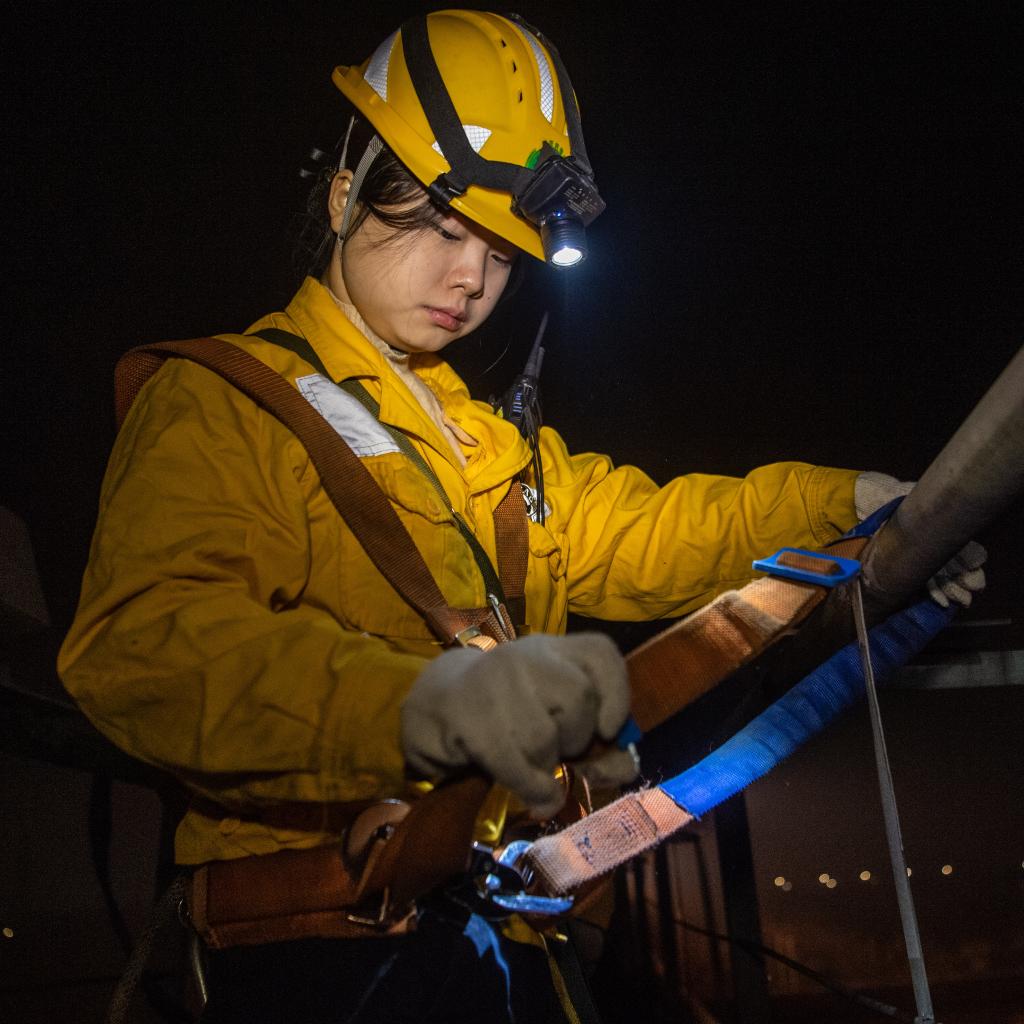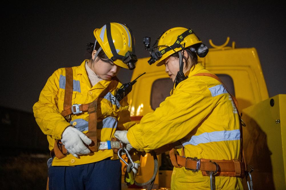 “00后”女孩何雪和母思琪是中国铁路成都局重庆供电段兴隆场电力工区的两名电力线路工。每个夜晚,她们和工友背负数公斤重的工具材料,从地面沿着近70度的爬梯攀上22米高的电塔和17米高的灯桥,对这里的5000余盏灯进行巡检维修,确保编组站场的照明安全。